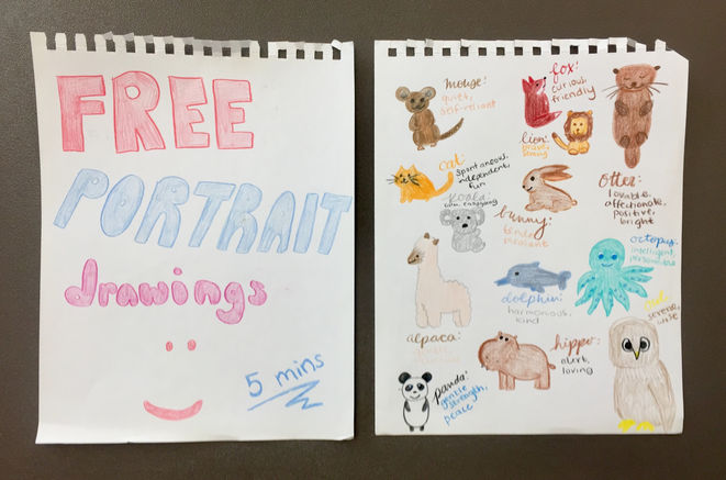 I commandeered a table in the Wilkinson Student Center on campus and put up a sign offering free portrait drawings. When people came up to me, I picked and drew spirit animals for them based on what they had told me about themselves. They were all a little nervous when I was about to show them the portrait, but they all got way more excited to receive their spirit animal drawing.